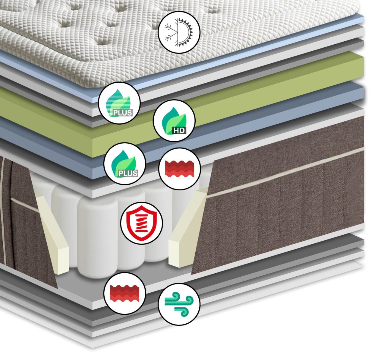 Este colchón cuenta con un núcleo de muelles ensacados Magatech Firm con box perimetral, que proporciona una gran estabilidad y durabilidad. Además, su capa de Biomemory HD, viscoelástico de alta densidad de 80 Kg/m3, y las capas de Visco Progressión Plus Gel, se adaptan perfectamente al cuerpo para aliviar la presión. Esto garantiza un descanso reparador y sin interrupciones. El tejido ClimaSense de este colchón regula activamente la temperatura, manteniendo una sensación de frescura y confort durante toda la noche.