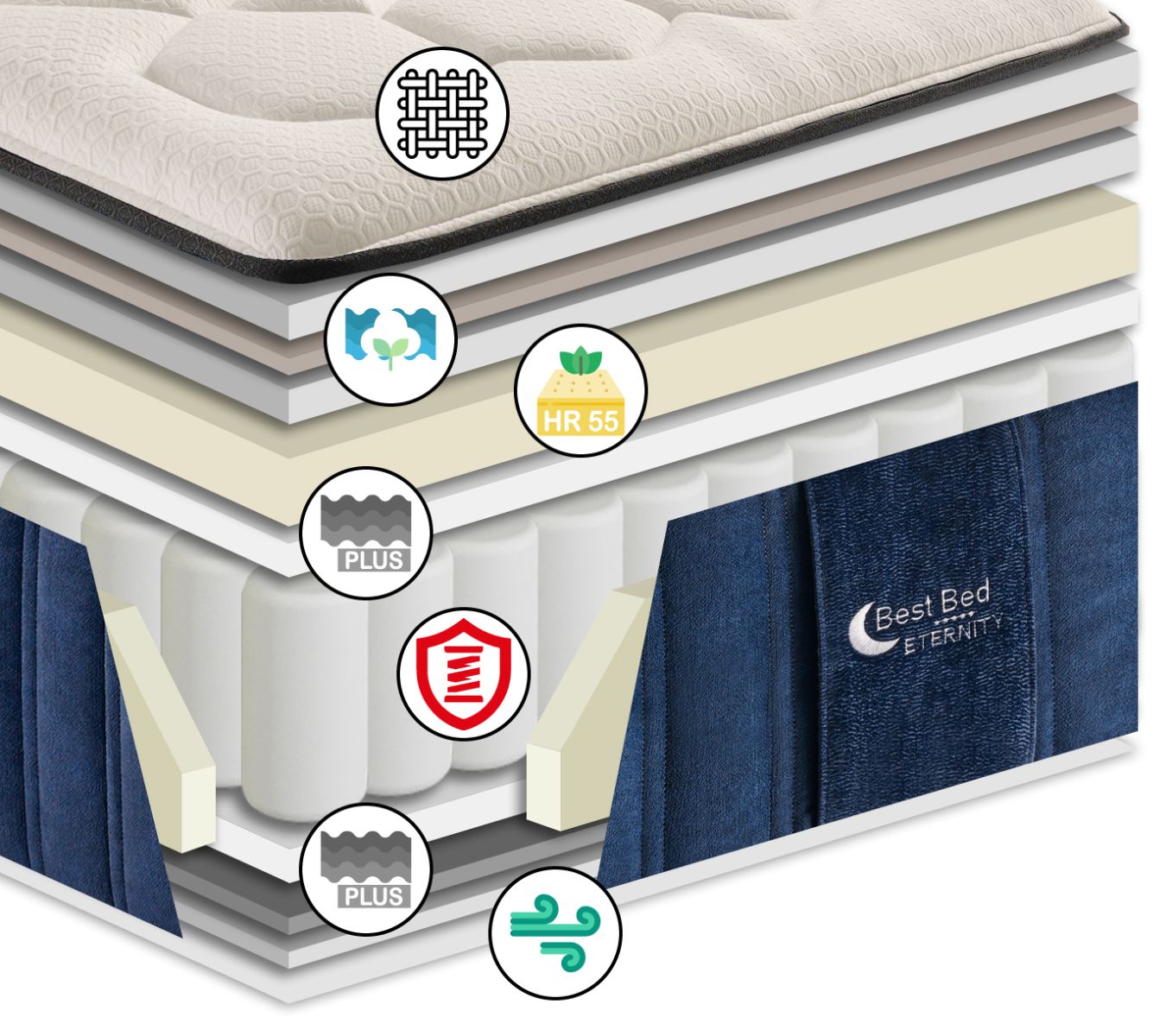 El colchón Bestbed Eternity está diseñado para ofrecer un descanso confortable gracias a la combinación de sus materiales de alta calidad, como la capa Naturcell Cotton Adapt y la espuma HR 55 BIO enriquecida con aceites naturales.