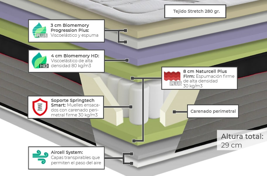 Este colchón de muelles ensacados ofrece una primera acogida confortable y progresiva gracias a su capa de Biomemory Progression Plus y a su capa de viscoelástico de alta densidad Biomemory HD 80 kg/m³. A continuación encontramos la capa de Naturcell Plus Firm, una capa de espumación firme que envuelve al núcleo, proporcionando una alta firmeza que nos ayuda a mantener nuestra columna alineada y una máxima consistencia. Su núcleo de muelles ensacados Magatech Smart con carenado perimetral firme 30 kg/m³, aporta firmeza al conjunto y proporciona durabilidad al colchón. Los muelles ensacados no se desgastan con el uso ni pierden firmeza. Adicionalmente, en la cara inferior, el colchón cuenta con Aircell System para facilitar una correcta aireación, manteniéndolo en condiciones higiénicas óptimas.