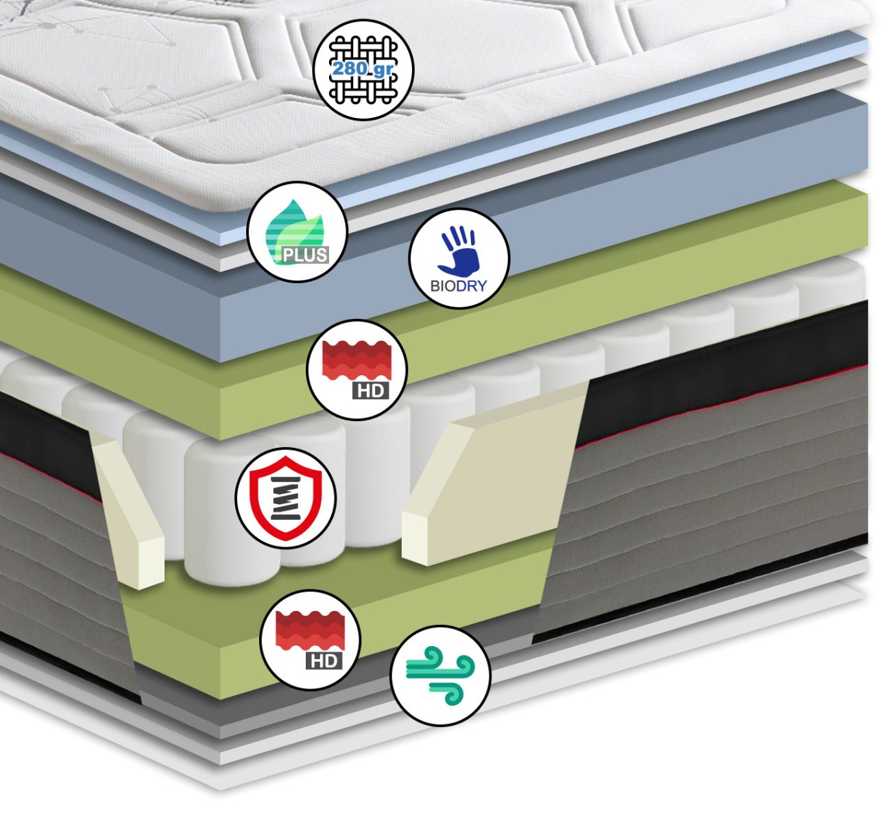 Este colchón de muelles ensacados ofrece una primera acogida confortable y progresiva gracias a su capa de Biomemory Progression Plus y a su capa de viscoelástico de alta densidad BioDry HD que regula la temperatura corporal. A continuación encontramos la capas de Naturcell HD Firm, una combinación de espumas firmes de máxima (40Kg/m3) y alta (30Kg/m3) densidades que nos ayuda a mantener nuestra columna alineada y una máxima consistencia. Su núcleo de muelles ensacados Magatech Smart con carenado perimetral firme, aporta firmeza al conjunto y proporciona durabilidad al colchón. Los muelles ensacados no se desgastan con el uso ni pierden firmeza. Adicionalmente, en la cara inferior, el colchón cuenta con Aircell System para facilitar una correcta aireación, manteniéndolo en condiciones higiénicas óptimas.