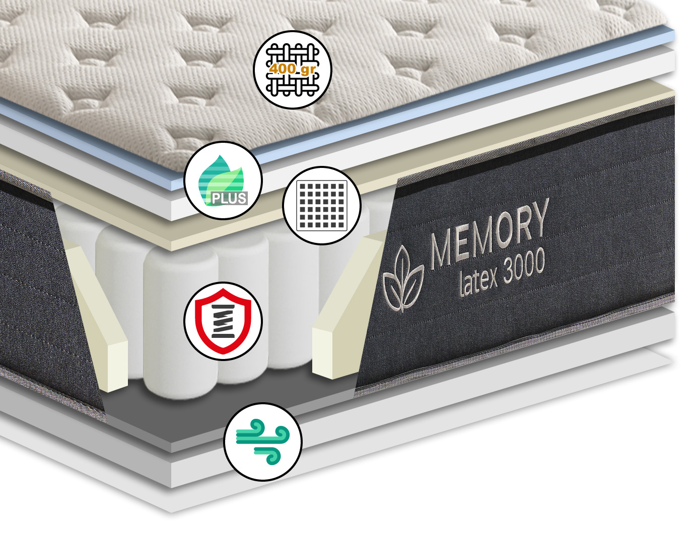 El colchón Memory Látex 3000 de muelles ensacados ofrece una sensación firme, pero con una agradable acogida, gracias a sus capas de viscoelástico, espuma y su capa de Látex. Recomendado para quienes buscan un colchón firme de gran comodidad, con buenas prestaciones, y con una cuidada selección de materiales de confort.