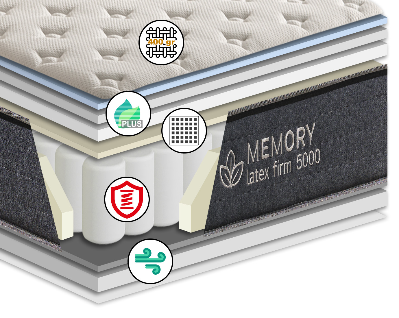 El colchón Memory Látex Firm 5000 de muelles ensacados es un colchón con una alta firmeza, pero con una agradable acogida, gracias a sus capas de viscoelástico, espuma y su capa de Látex. Recomendado para quienes necesitan un colchón con un alto grado de firmeza, con buenas prestaciones, y con una cuidada selección de materiales de confort.