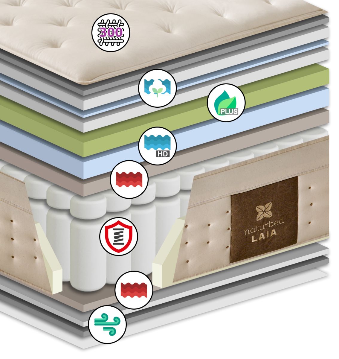 El Colchón de muelles ensacados Naturbed Laia combina un descanso ergonómico con un confort avanzado. Su núcleo de muelles ensacados Magatech con 7 zonas y refuerzo de Nanomuelles Magatech Smart proporciona un soporte preciso y estable, adaptándose a cada parte del cuerpo para favorecer una correcta alineación. Sus capas de Naturcell Cotton Adapt y Biomemory Plus ofrecen una acogida progresiva y envolvente, mientras que las espumas Naturcell HD Adapt de alta densidad y Naturcell Firm aportan resistencia, durabilidad y un extra de estabilidad. Sus capas naturales de lana de camello y algodón junto a una espuma adaptable y fibra, proporcionan una suavidad extra, regulan la temperatura y la humedad de forma natural. Una combinación equilibrada de materiales que transforma cada noche en una experiencia de descanso más fresca, saludable y sofisticada.