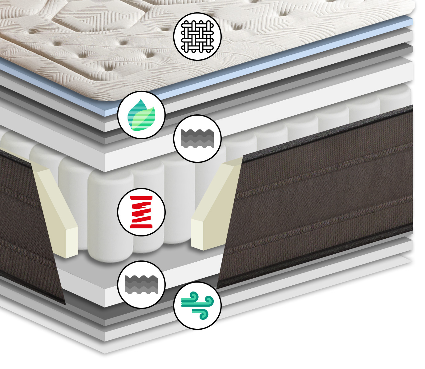 Capa de espuma que actúa como un amortiguador que suaviza la transición entre las capas superiores de confort y el soporte de los muelles. Esto mejora la adaptabilidad del colchón, reduciendo los puntos de presión y proporcionando una sensación más envolvente sin comprometer la firmeza y la independencia de movimiento que ofrecen los muelles ensacados.