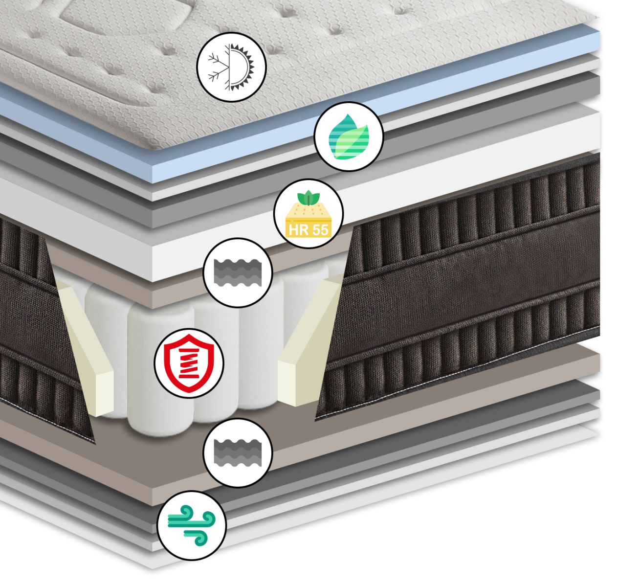 Capa de espuma que actúa como un amortiguador que suaviza la transición entre las capas superiores de confort y el soporte de los muelles. Esto mejora la adaptabilidad del colchón, reduciendo los puntos de presión y proporcionando una sensación más envolvente sin comprometer la firmeza y la independencia de movimiento que ofrecen los muelles ensacados.