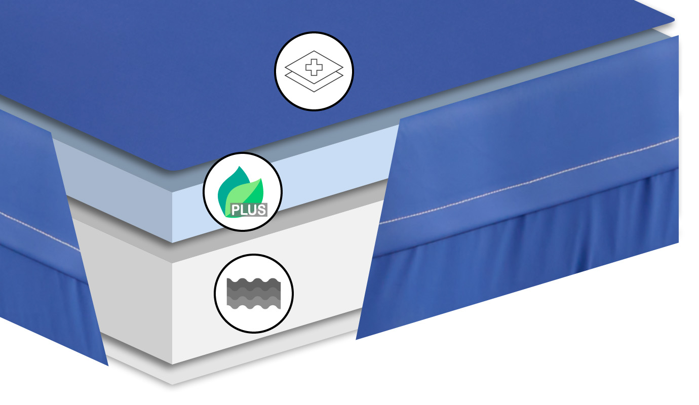 Transpirable e impermeable. Permite su lavado a alta temperatura (hasta 90º C). Dispone de un tratamiento antialérgico y previene la aparición de úlceras.
