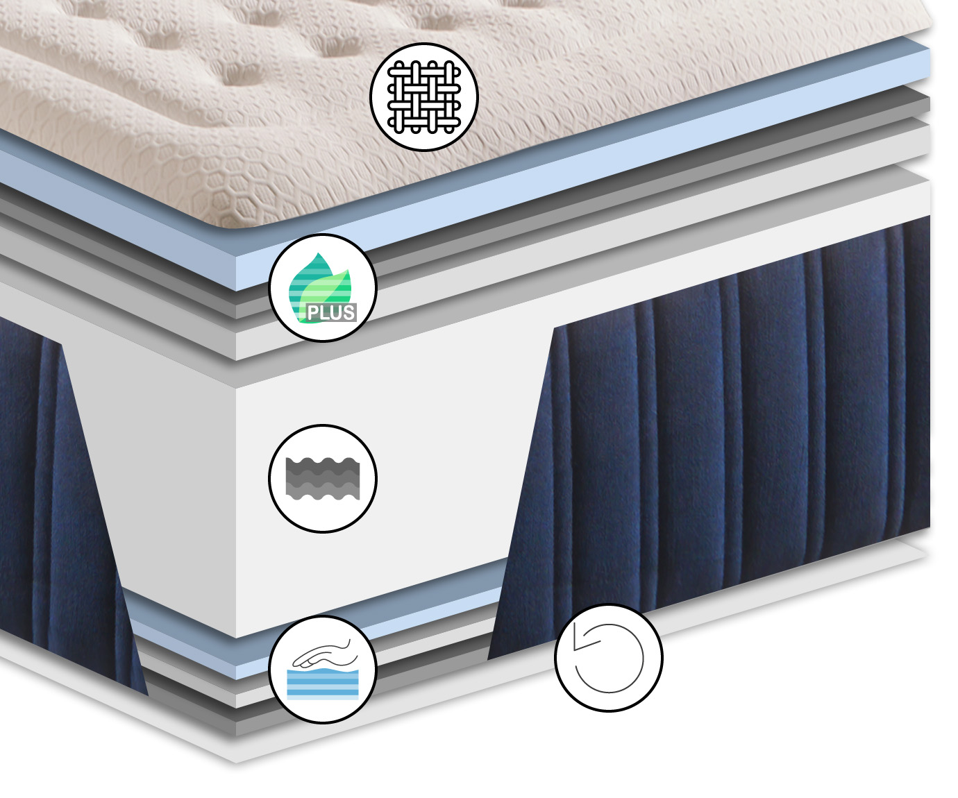 Capas de viscoelástico con gel, espuma y fibra que aportan una acogida progresiva, confort y firmeza al conjunto.