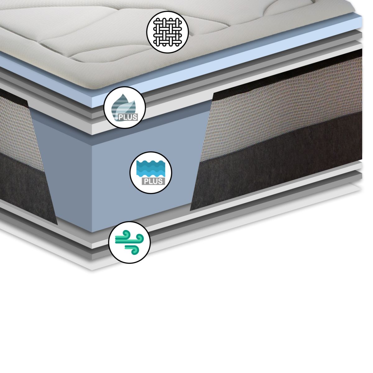 Este colchón viscoelástico incorpora como capa superior Biomemory Progression Adapt Plus, una combinación de viscoelástica con gel, espuma adaptable y fibra, que proporciona una agradable sensación de confort desde el primer contacto con el cuerpo.
