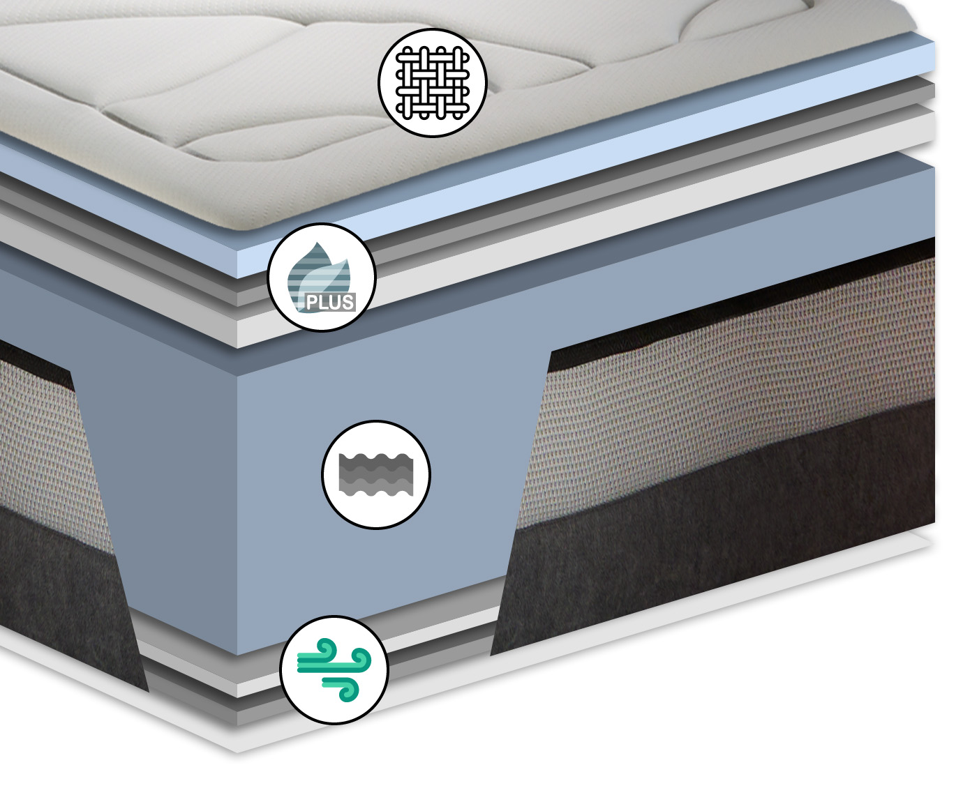 Este colchón viscoelástico cuenta con una primera capa de Biomemory Progression Adapt Plus, formado por viscoelástico con gel, espuma adaptable y fibra. Esta combinación de capas otorgan un extra de confort en el primer contacto.