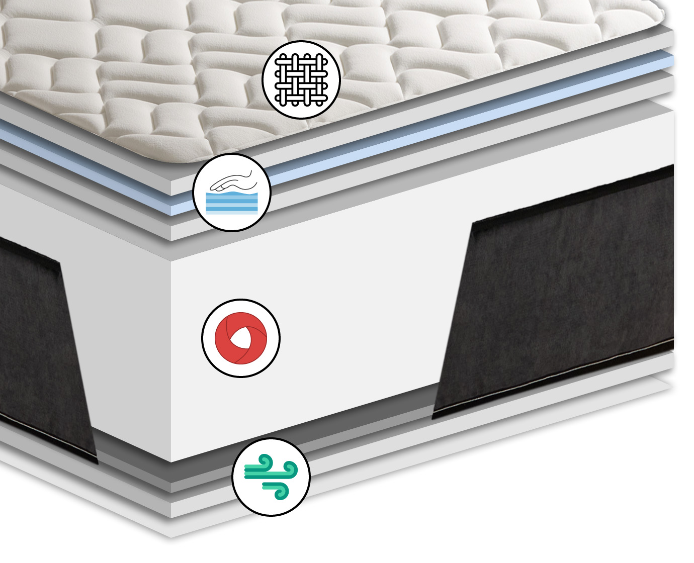 - Viscoelástico con partículas de gel: Aporta adaptabilidad y memoria en la acogida, y sus inserciones de gel ayudan a mantener una temperatura óptima durante la noche