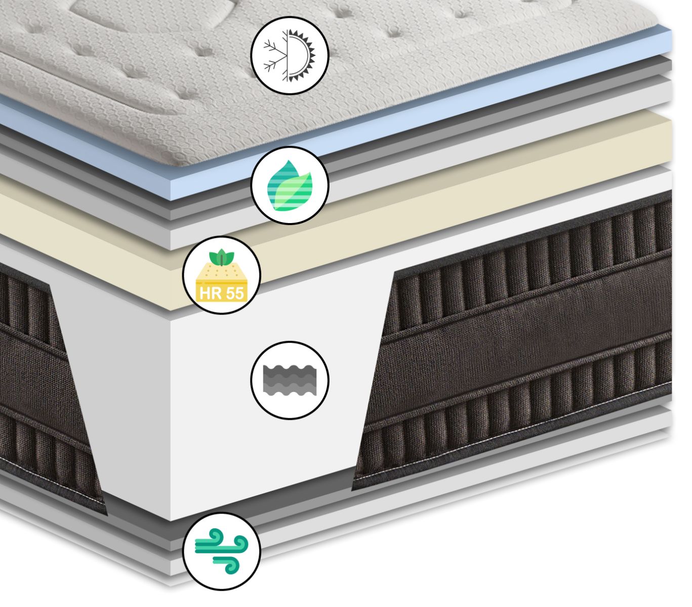 • 4 cm HR 55 Bio: Espuma de alta densidad (55 kg/m³) enriquecida con aceites naturales, que proporciona firmeza, gran resistencia y un soporte adaptable que mejora el rendimiento del colchón.