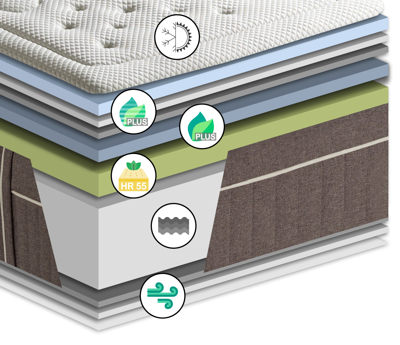 Capa de espuma de máxima densidad (55 kg/m3) de última generación, con aceites naturales, que aporta una gran adaptabilidad y confort al conjunto.