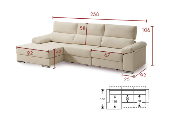 - Dispone de un práctico arcón bajo el módulo del chaise longue con medidas: